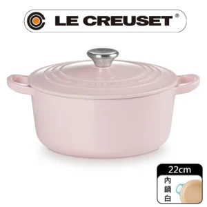 • LE CREUSET-盒損福利品_琺瑯鑄鐵鍋圓鍋 22cm(雪紡粉-鋼頭-內鍋白)