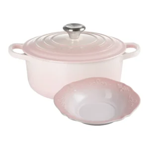 • LE CREUSET典藏圓形鑄鐵鍋 22cm 3.3L【貝殼粉】 + 永恆花蕾系列 深盤 20cm 【貝殼粉】(電磁爐 IH爐可用)